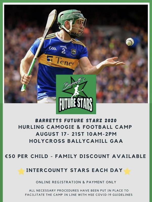 Hi all, Cathal Barrett here. Just a reminder that my camp runs this year from July 17th to 21st 10-2pm each day in Holycross GAA field. Its €50 for each child with family rates available. For more information contact me on 0871315662. The camp will be run in accordance with Covid 19 guidelines. Hope to see you there. Please click on the following link to register for the camp.